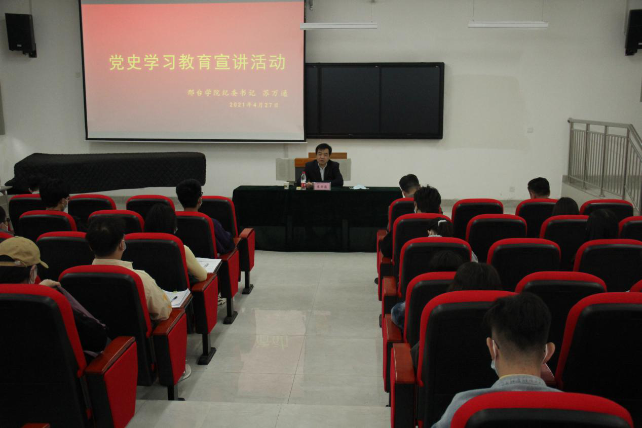今年是中国共产党成立100周年,也是“两个一百年”奋斗目标历史交汇的关键节点。为了贯彻落实学校党史学习教育活动有关精神,4月27日下午4:00,校纪委书记苏万通在第四教学楼1006多媒体教室进行党史学习教育专题报告会。文学院党委书记施江斌、戏剧影视艺术系党支部书记刘志涛和近百名师生参加了报告会。